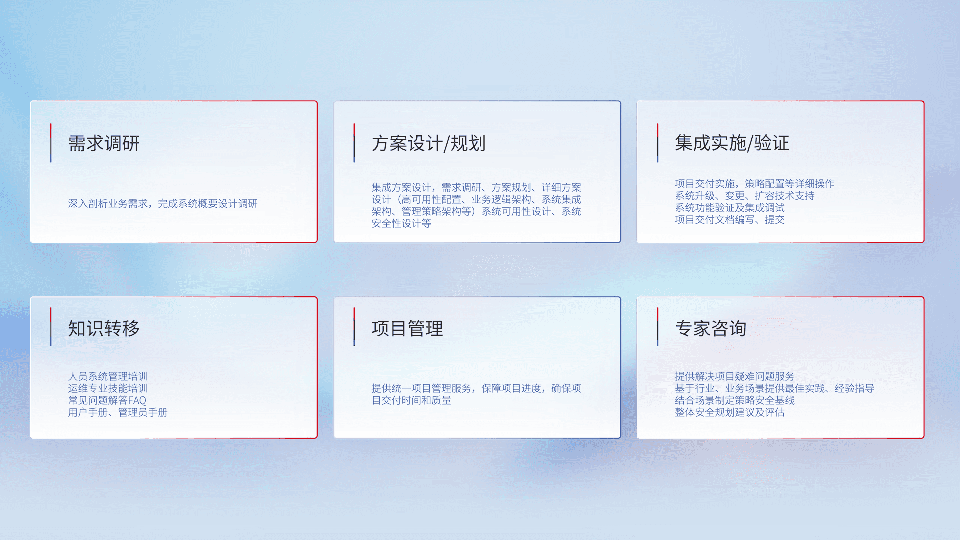 针对客户行业特性,,,,将宏观的安全战略和需求,,,,通过专业的交付服务,,,,实现项目落地,,,为客户提供标准规范的集成交付服务。。